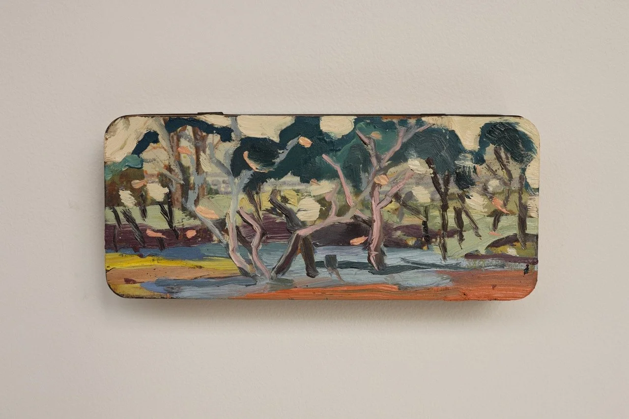 Nicole Kelly, Yellow Day, 9.5 x 4 x 2 inches, oil on antique tin, 2024